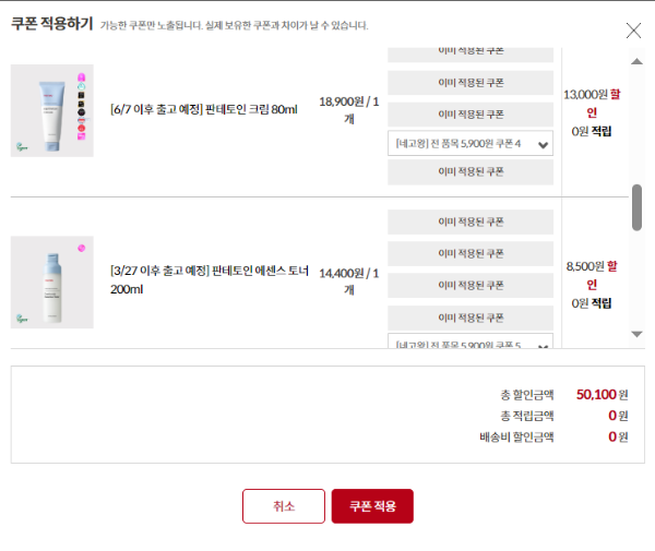 그럼 요런 창이 뜰텐데 쿠폰을 하나씩 적용하게 되면