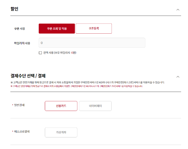여기서 할인 부분에 쿠폰 조회 및 적용 버튼을 클릭하면 되요!