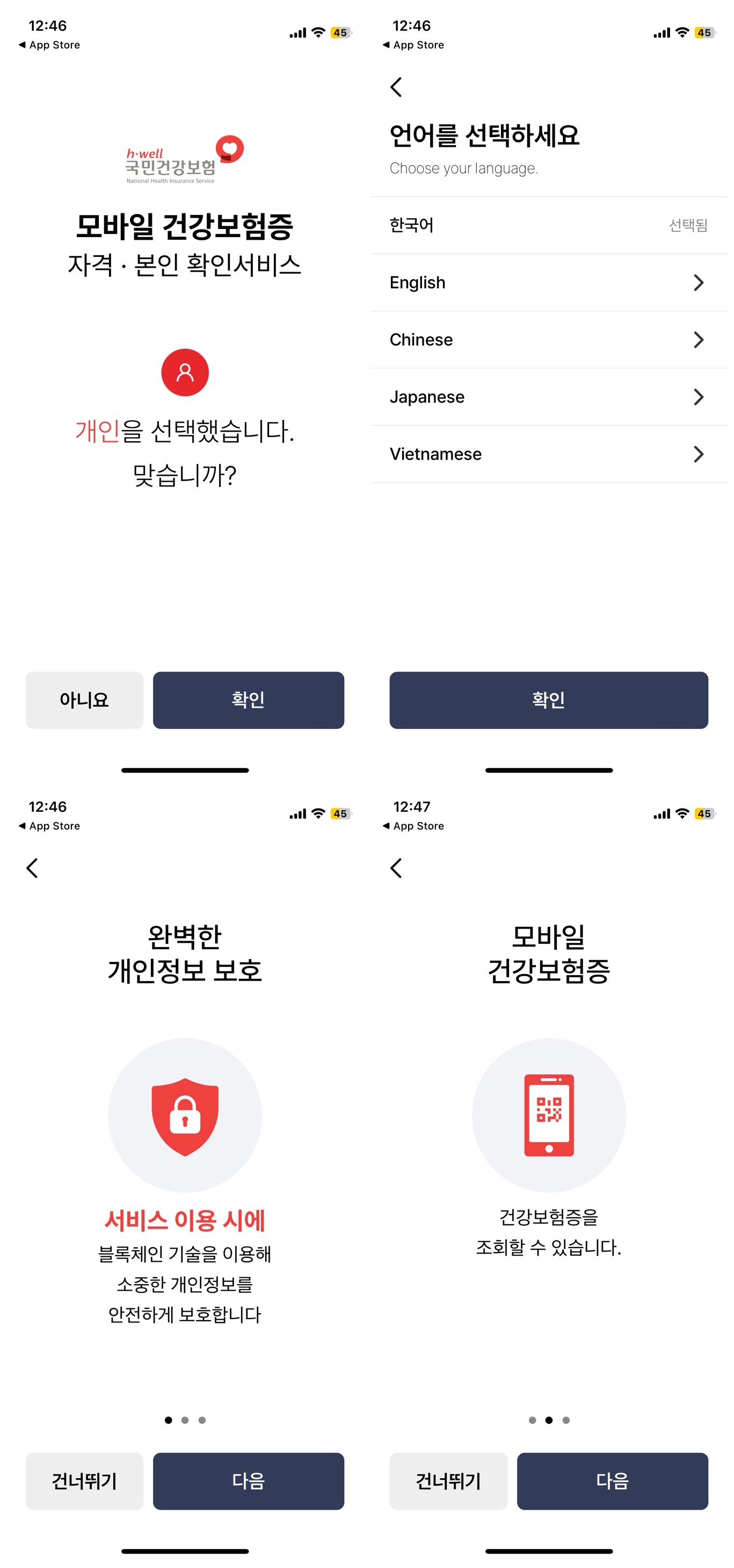 앱을 설치한 후, 본인 인증 절차를 진행합니다. 본인 인증은 휴대폰 인증이나 공인인증서를 통해 간편하게 할 수 있습니다.