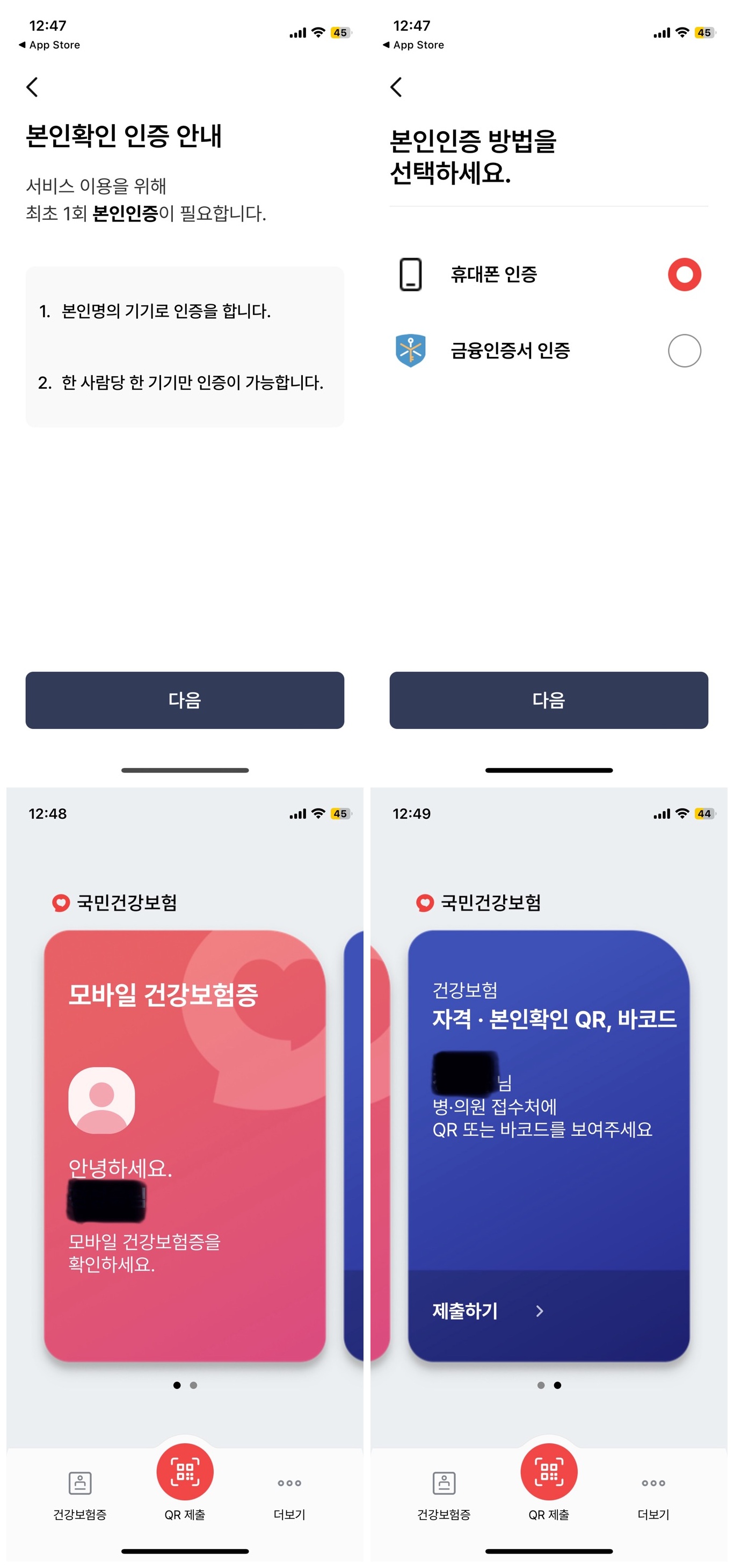 앱을 설치한 후, 본인 인증 절차를 진행합니다. 본인 인증은 휴대폰 인증이나 공인인증서를 통해 간편하게 할 수 있습니다.