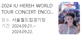 2024년 9월, 아이유의 대규모 콘서트가 서울 상암 월드컵경기장에서 이틀간 열립니다. 이 경기장은 약 66,000명을 수용할 수 있는 서울에서 가장 큰 장소 중 하나로, 잠실 주경기장이 리모델링 중인 가운데 더 많은 주목을 받고 있습니다. 이곳은 대규모 공연이 자주 개최되는 장소로, 지난 5월 임영웅의 공연도 성황리에 열렸습니다.