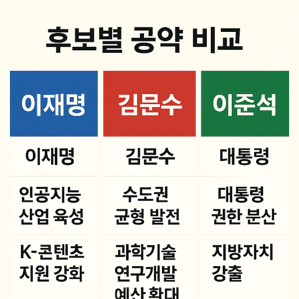 김문수 후보는 수도권과 영남의 보수 지지층을 중심으로 국가 균형 발전, 과학기술 예산 확대, 안보 강화 등을 주요 기조로 삼았습니다. 이준석 후보는 대통령 권한 분산, 지방분권, 청년 일자리 확대 등 정치개혁적 성격의 공약을 중심으로 젊은 세대의 표심을 자극했습니다.