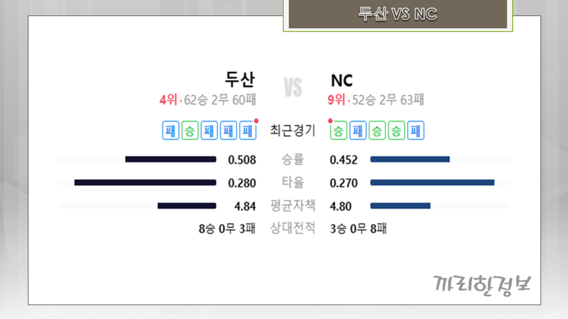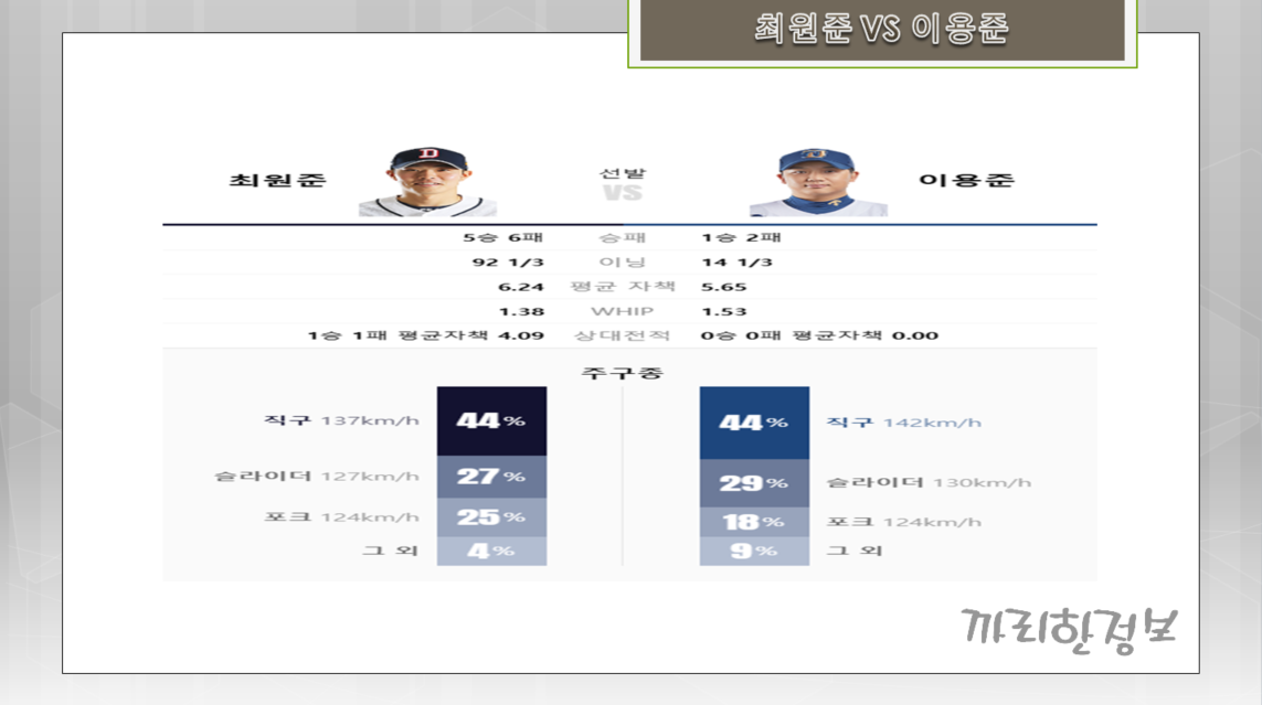 내일 펼쳐질 KBO 리그의 두산 베어스와 NC 다이노스의 경기는 그 어느 때보다도 치열할 것으로 예상됩니다. 특히 이번 경기는 두 팀의 선발 투수인 최원준과 이용준의 맞대결이 큰 관심을 끌고 있습니다. 최근 경기에서 두 팀이 보여준 흐름과 선발 투수들의 컨디션을 분석하여 내일의 경기 결과를 예측해보겠습니다. 이 글에서는 두산과 NC의 최근 10경기 성적, 투수들의 최근 성적, 그리고 타격 지표들을 상세히 다루어 두 팀의 흐름을 파악하고자 합니다.