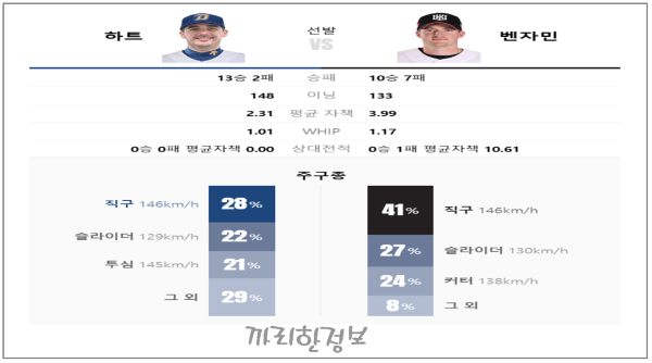 NC의 하트는 최근 5경기에서 2.75의 평균자책점을 기록하며 뛰어난 제구력을 선보이고 있습니다. 피안타율도 0.210으로 상대 타자들을 효과적으로 막아내고 있죠. 반면, 벤자민은 3.10의 평균자책점을 기록하며 안정적인 피칭을 유지하고 있지만, 하트에 비해 피안타율이 조금 더 높은 편입니다. 두 선수 모두 삼진 능력도 뛰어나며, 내일 경기에선 각 팀의 타선이 얼마나 효과적으로 상대 선발을 공략할지가 관건이 될 것입니다.