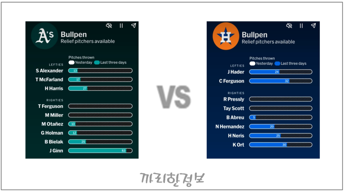 오클랜드와 휴스턴은 최근 10경기에서 휴스턴이 7승 3패로 우위를 점하고 있습니다. 특히 홈에서의 경기에서는 휴스턴이 더 강한 모습을 보이고 있으며, 오클랜드는 원정 경기에서 다소 불안한 수비력을 보입니다. 그러나, 오클랜드의 타선이 최근 상승세를 타고 있어 휴스턴의 투수진을 상대로 얼마나 득점 기회를 만들 수 있을지가 승부의 열쇠가 될 것입니다.