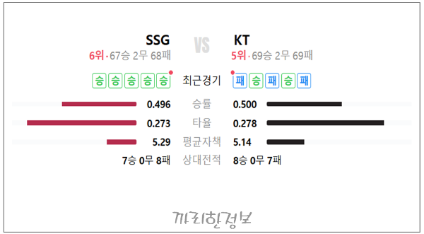 SSG와 KT의 최근 10경기 맞대결에서 KT가 근소한 우위를 점하고 있습니다. KT는 최근 경기에서 안정된 불펜 운영과 타선의 폭발력을 바탕으로 승리를 거둬왔지만, SSG 역시 강력한 선발 투수진을 기반으로 안정적인 경기를 펼치고 있습니다. 내일 경기에서는 어떤 팀이 흐름을 주도할지 관심이 집중됩니다.