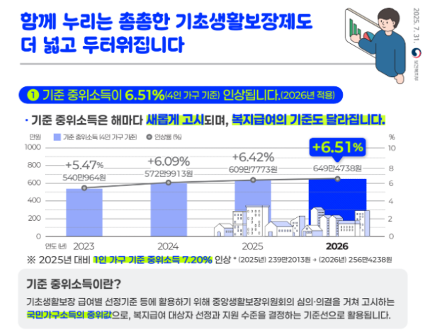 이번 2026년 기준중위소득 인상 폭은 역대 최대인 6.51%입니다.