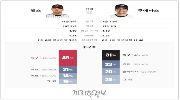 LG의 엔스는 시즌 후반부 들어 좋은 페이스를 유지해 왔습니다. 하지만 최근 몇 경기에서 제구가 다소 흔들리는 모습도 보였는데, 오늘 경기에서 이러한 불안정함을 얼마나 잘 극복할 수 있을지가 관건입니다. 반면, KT의 쿠에바스는 꾸준한 활약을 펼치며 팀을 준플레이오프까지 이끌어 왔습니다. 그의 강점은 주자가 있을 때 침착함을 잃지 않는다는 점인데, 이런 특성이 오늘 경기에서 중요한 변수가 될 것입니다